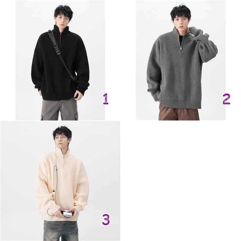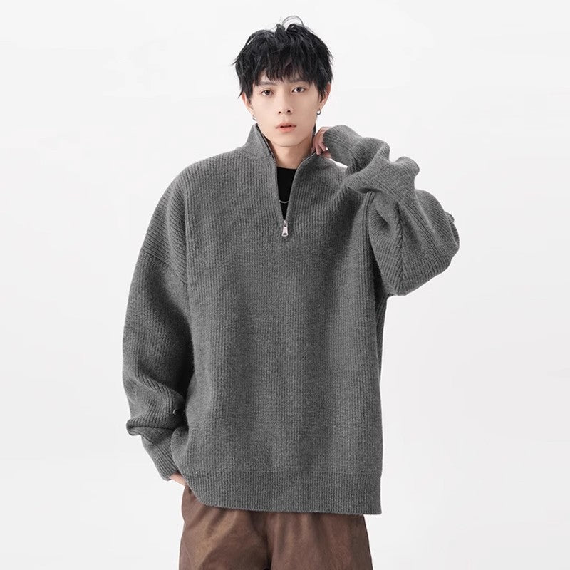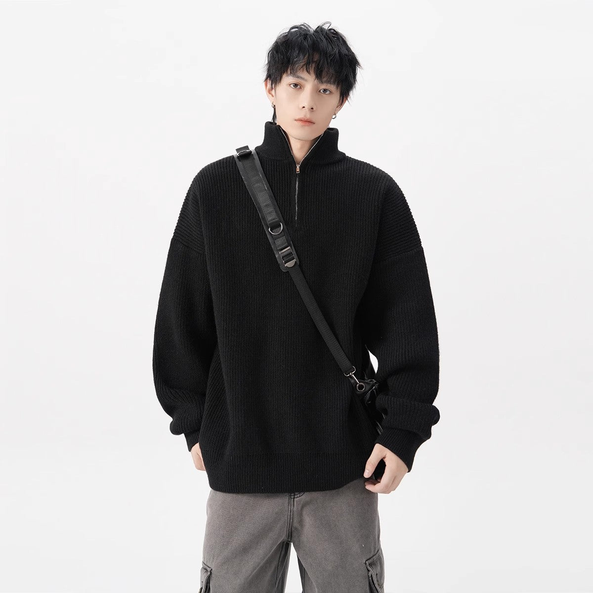 トレンド感のあるハーフジップ仕様のオーバーサイズニットセーター。シンプルながらも、ルーズなシルエットとハーフジップがアクセントになり、カジュアルからモードスタイルまで幅広く対応可能。