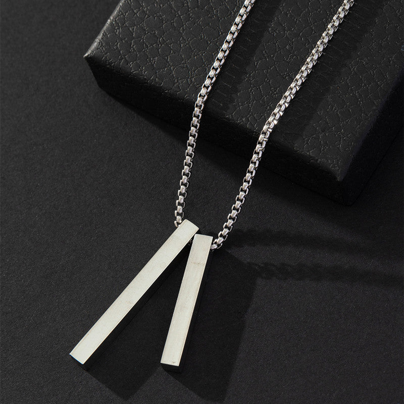 シンプルながらも洗練された印象を与えるダブルスティックペンダントのシルバーネックレス。ミニマルなデザインで、さりげなく個性を演出できます。
