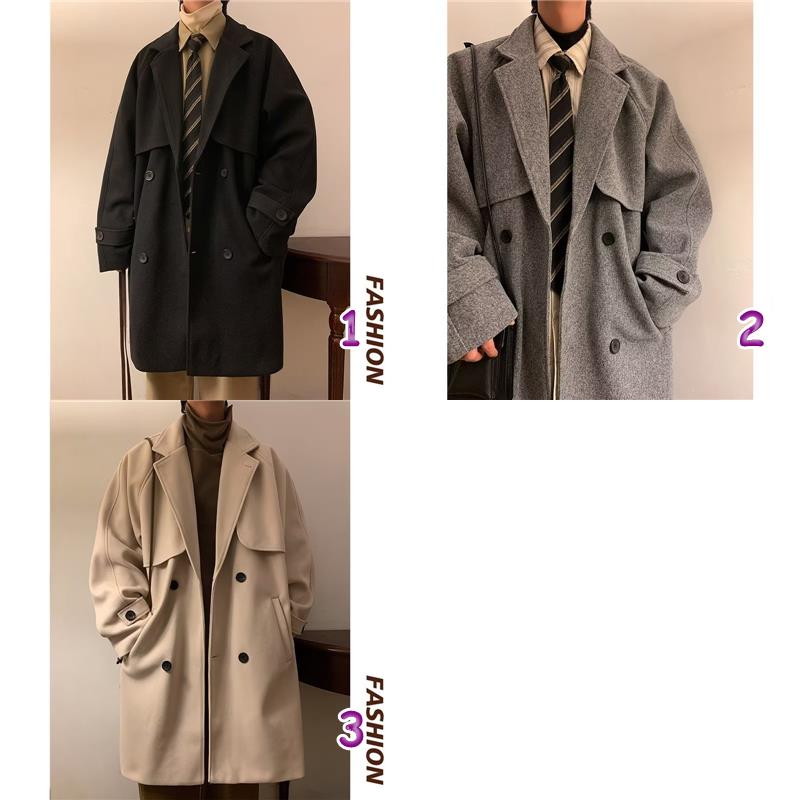 クラシックなダブルボタン仕様と大きめのラペルが特徴的なダブルコート。シンプルながら洗練されたデザインで、都会的でモダンな印象を与えます。
